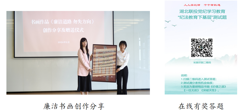 ?講解《中國共產(chǎn)黨紀(jì)律處分條例》2023年修訂版的核心精神,結(jié)合典型案例深入淺出解讀重點(diǎn)條款,“一堂課”緊扣黨紀(jì)學(xué)習(xí)教育主旋律;幸福、法治、權(quán)力、牢獄、學(xué)識,人生道路千萬條,不一樣的選擇、不一樣的歸宿,“一幅畫”《廉潔道路,勿失方向》昭示廉與正的方向;雄關(guān)漫道真如鐵,而今邁步從頭越,“一首詩”《憶秦娥·婁山關(guān)》重溫偉大建黨精神;“遵守紀(jì)律人人要自覺,互相監(jiān)督切莫違犯了”,“一首歌”《三大紀(jì)律八項(xiàng)注意》唱響聯(lián)投人始終將紀(jì)律和規(guī)矩挺在前面的堅(jiān)守;“碧海藍(lán)天,凈由廉欣”“去污沉淀水質(zhì)優(yōu),廉潔洗滌心靈美”,“一句話”寄寓本色初心;“黨的六大紀(jì)律有哪些,新修訂的《中國共產(chǎn)黨紀(jì)律處分條例》自何時起施行?”,“一張卷”考問紀(jì)法常識?!傲鶄€一”的宣教活動讓現(xiàn)場黨員干部員工“止饑解渴”、學(xué)有所獲。
